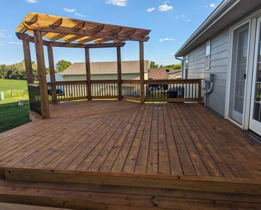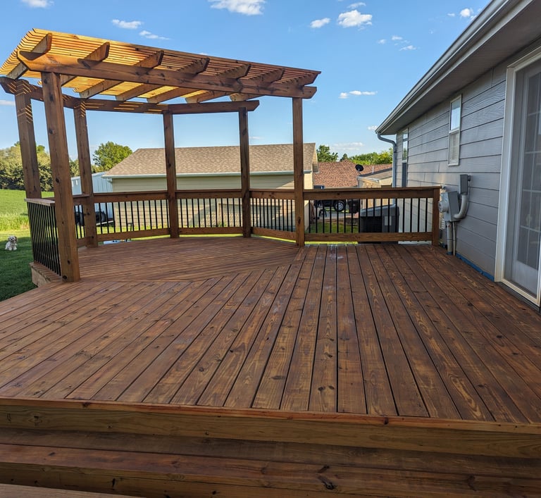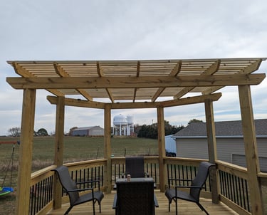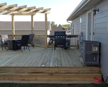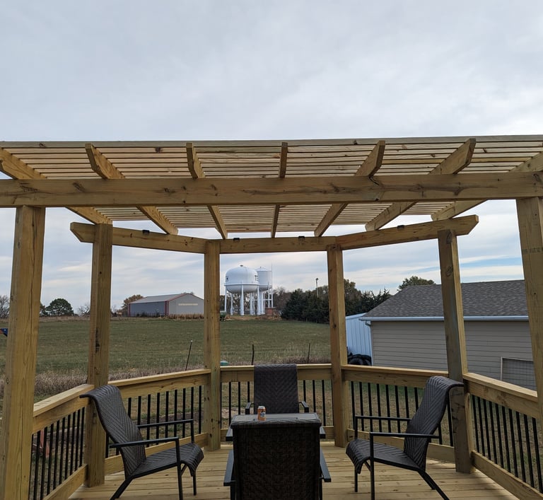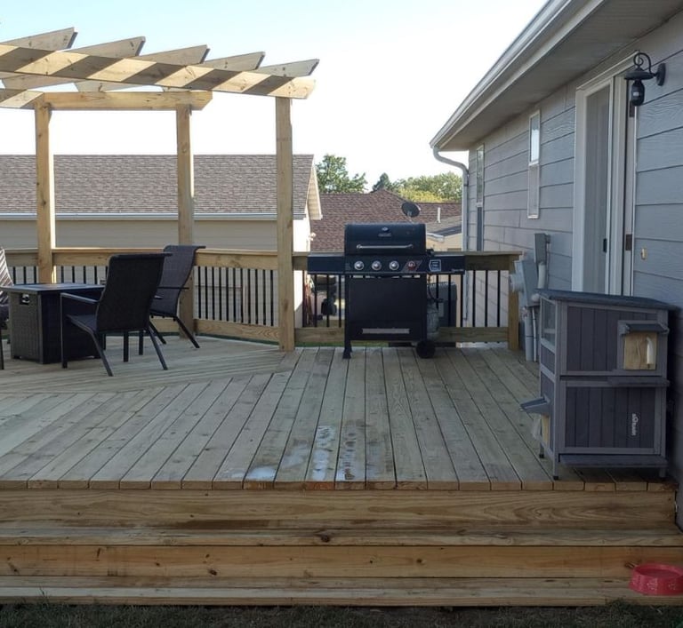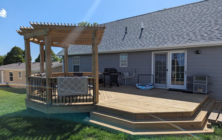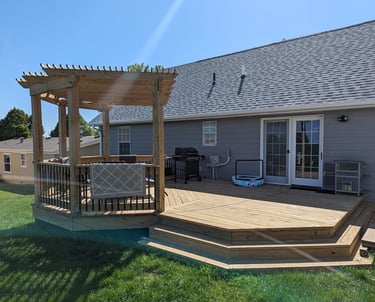 New custom deck and pergola in treated lumber. This deck was designed and built based off a simple drawing given to us by the customer. We have the experience and craftsmanship for custom builds that are much more than a simple rectangle.